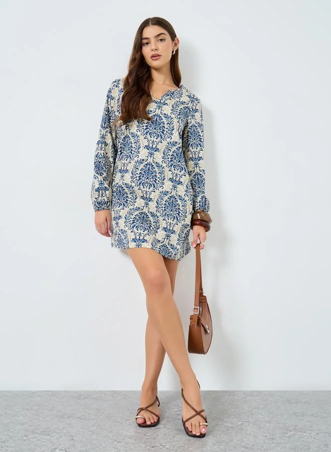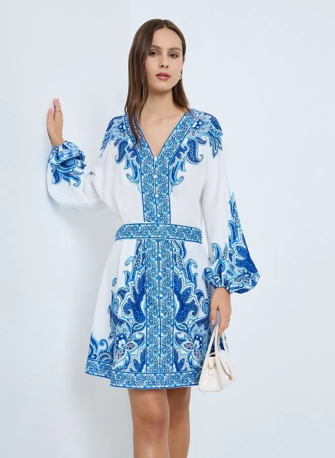 Blue Floral Printed Balloon Sleeve Mini Dress
