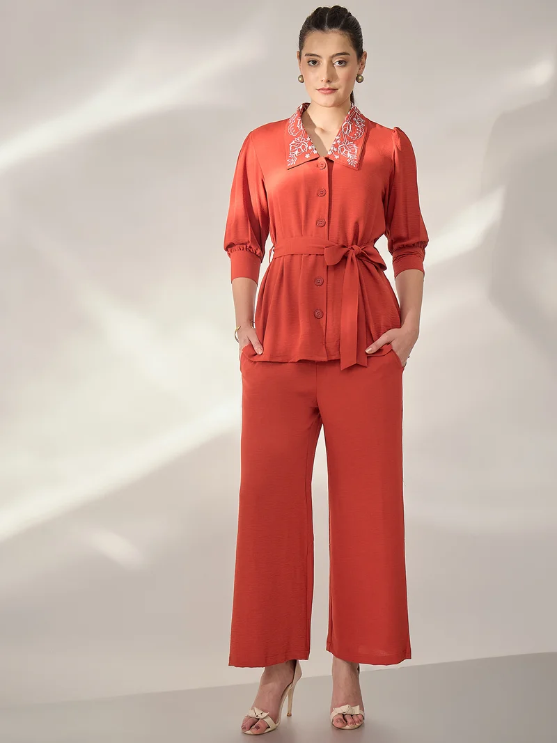 PANIT Embroidered Collared Shirt With Trouser Co-ord Set - Dark Orange