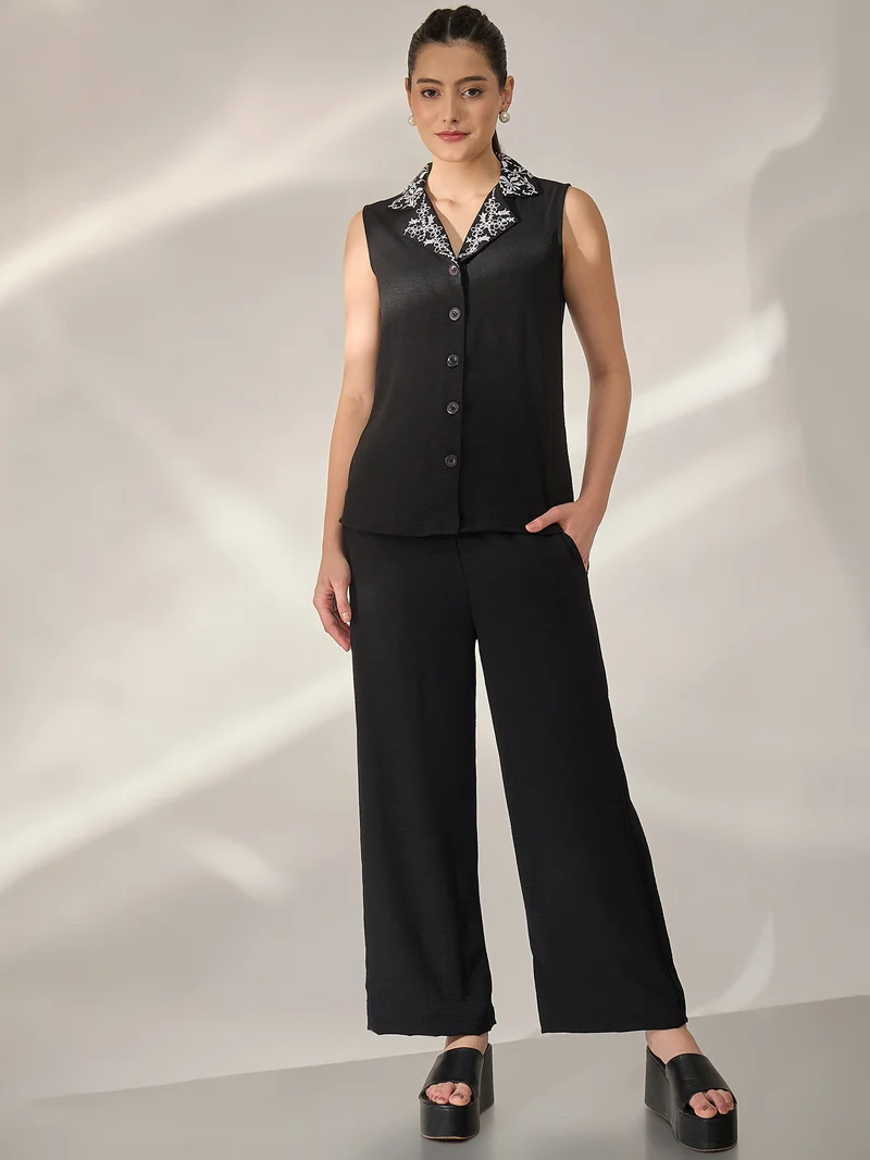 PANIT Embroidered Collared Shirt With Trouser Co-ord Set - Black