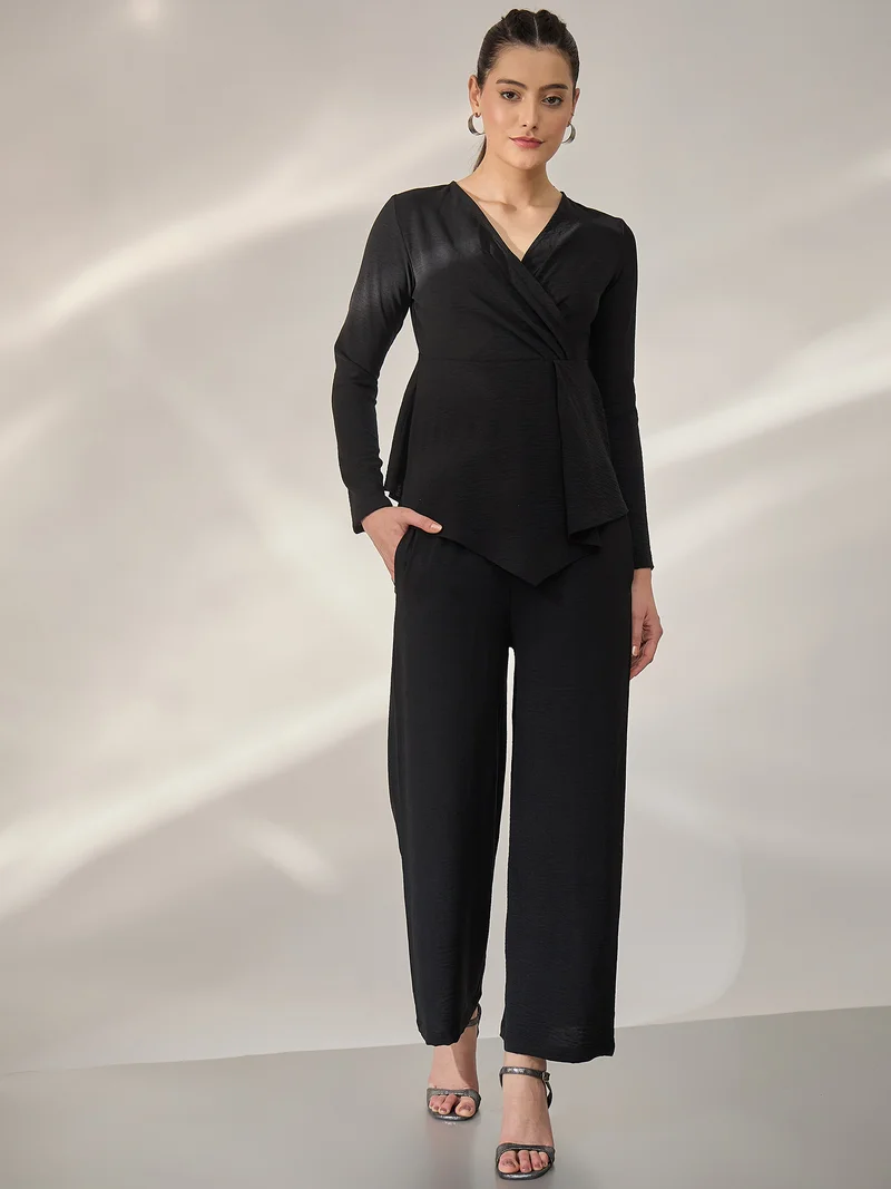 PANIT Black V-Neck Top with Trouser Co-Ords Sets