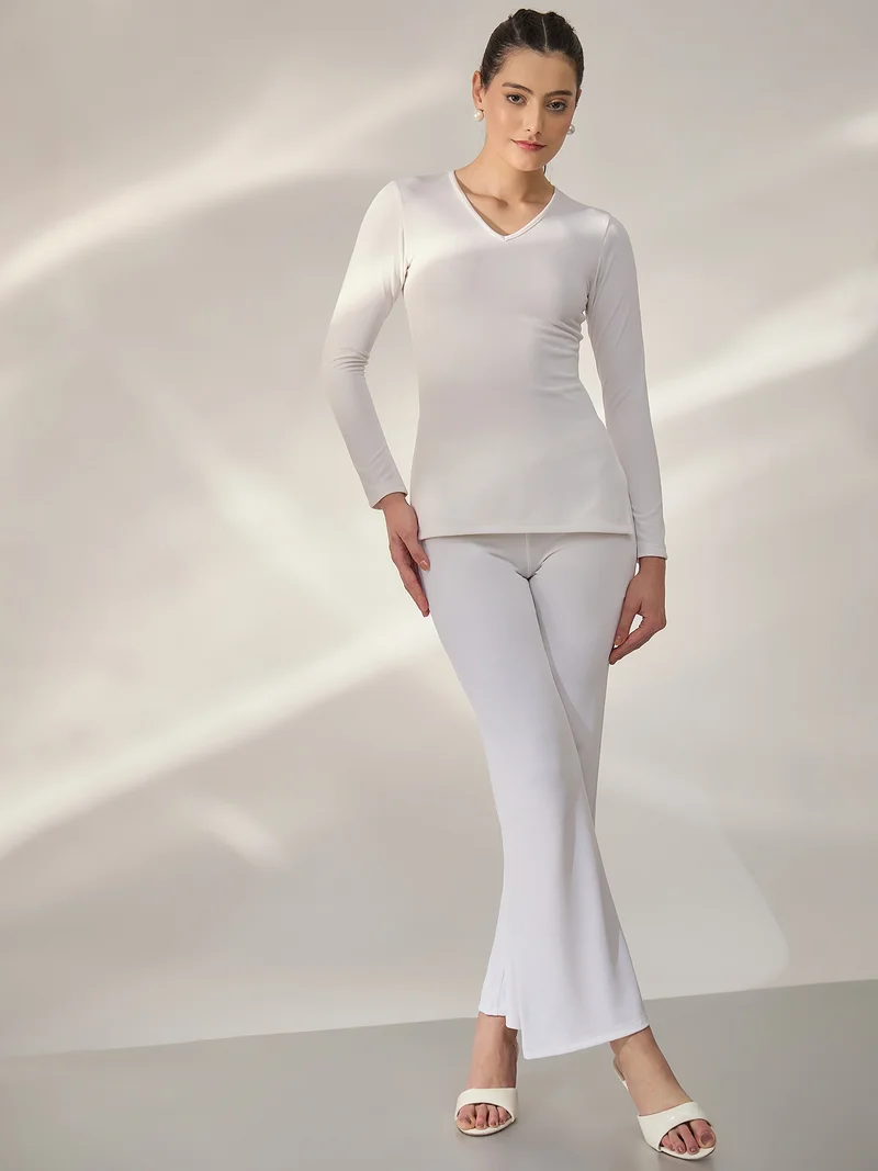 PANIT White Ribbed Fitted Tops with Trouser Co-Ords Set