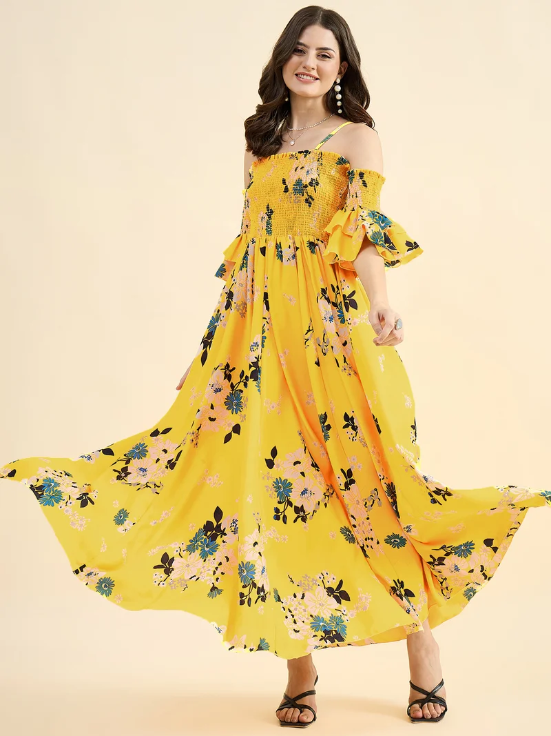 PANIT Yellow Floral Printed Smocked Off Shoulder Georgette Maxi Dress