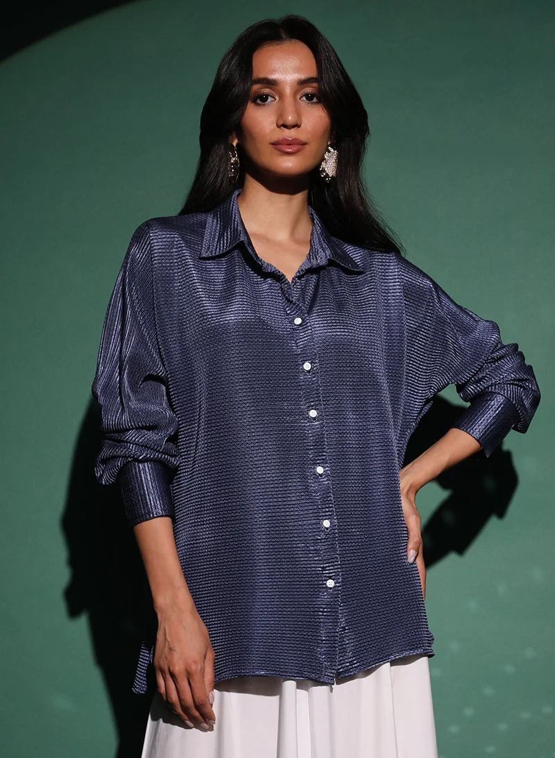 Women's Navy Blue Textured-Pleat Shirt For Casual Wear | Spread Collar | Long Sleeve | Button Closure | Shirt Designed With Comfortable Fit For Woman & Girls
