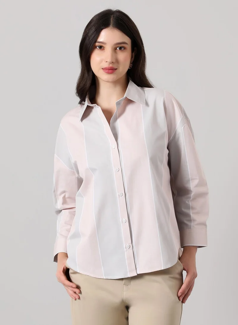 Women's Ecru Beige Twill-Striped Oversized Shirt
