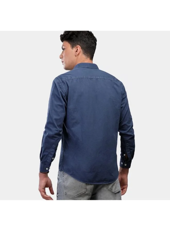 Navy Blue Plain Casual Fit Weaving Casual Cotton Blended Shirt