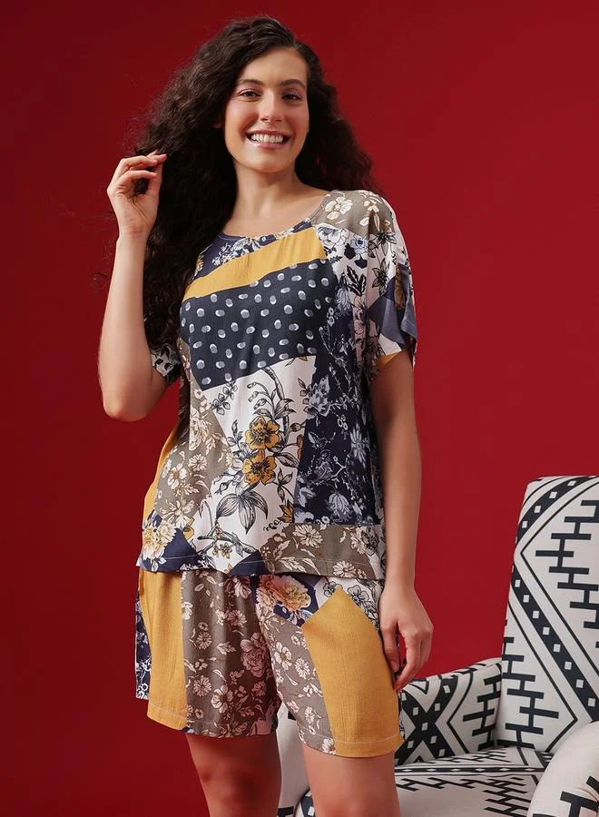 Clovia Floral Print Shawl Lapel Shirt and Pyjama Set