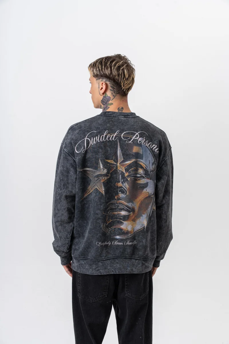 Men's Divided Printed Washed Crew Neck Oversize Sweatshirt Black