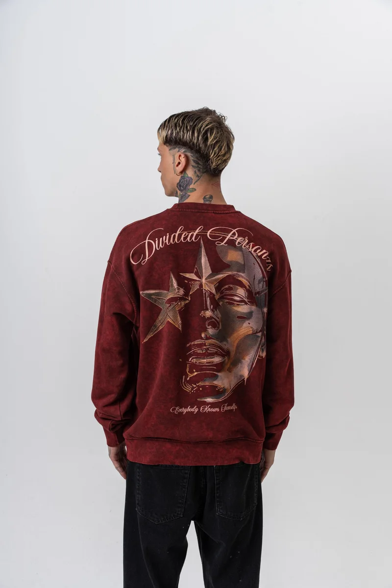 Men’s Divided Printed Washed Crewneck Oversize Sweatshirt Burgundy