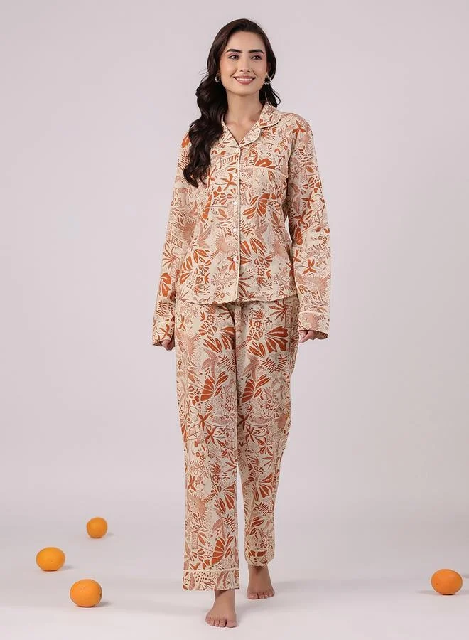 Sanskrutihomes Women Beige Floral Printed Pure Cotton Top and Pyjama Set with Jacket
