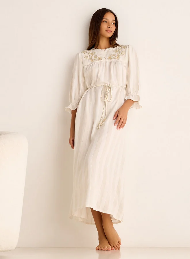 Long-Sleeved Maxi Night Gown with Embroidered Stripes
