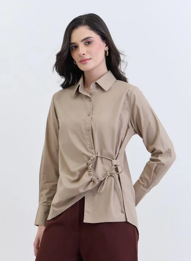 Women Beige Cotton Long Sleeve Tie-Waist Shirt