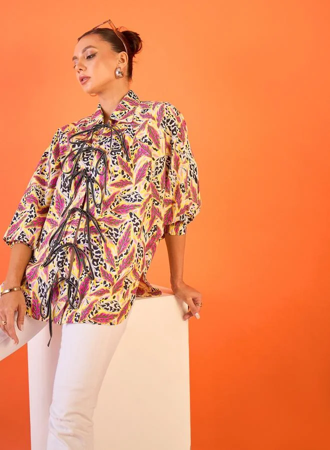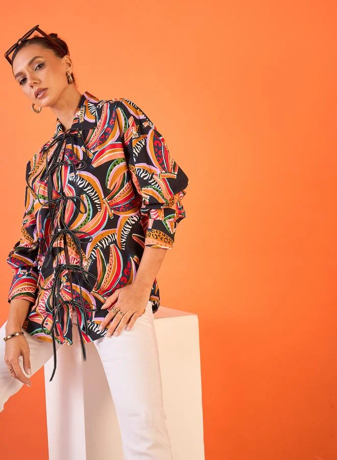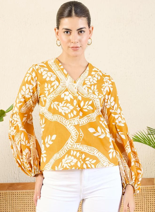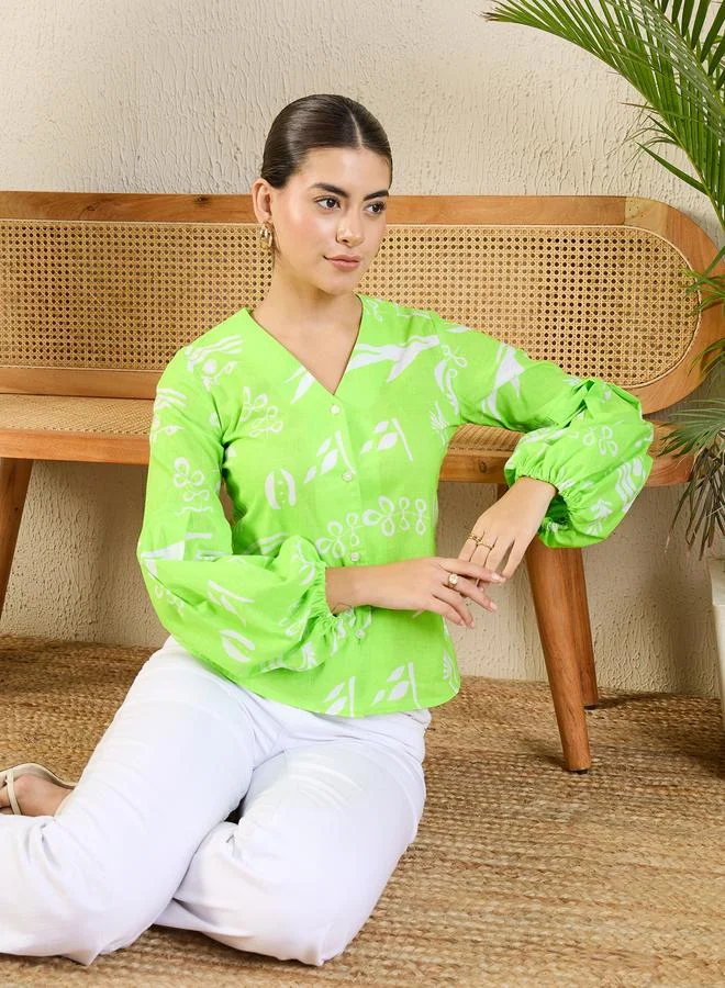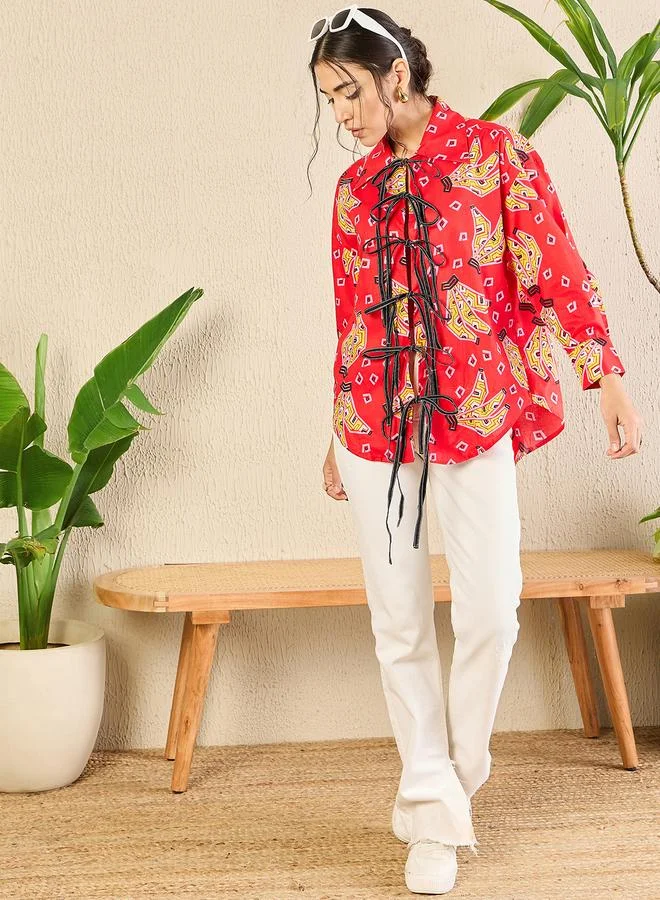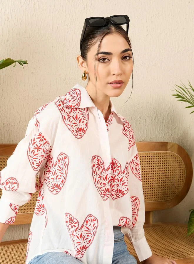 Red Fruit Print Cotton Shirt with Balloon Sleeves