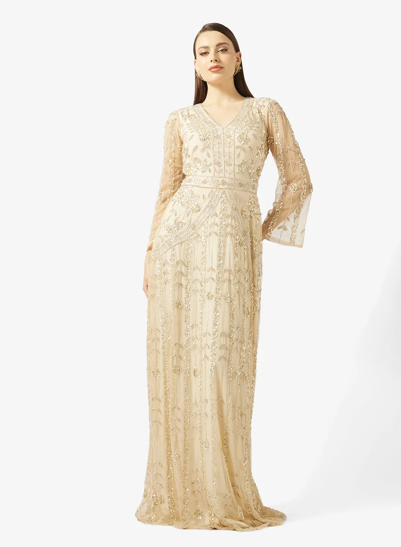 Flared Sleeve Embellished Sweetheart Neck Maxi Dress