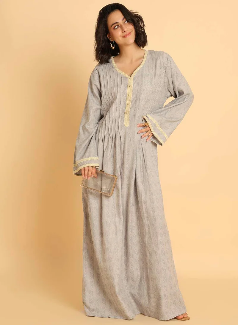 Tiny Flower Print And Neck Embroidered Arabic Jalabiya Dress