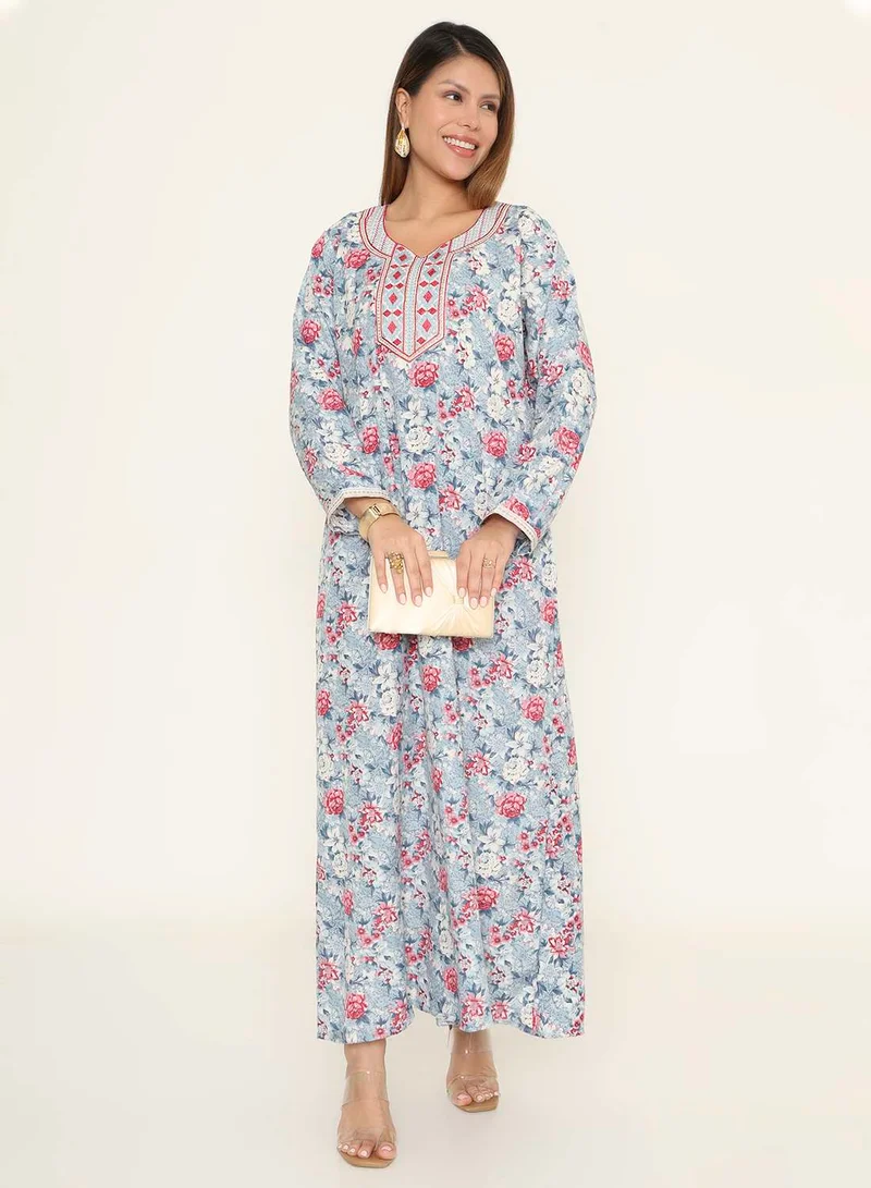 Women's Aqua Blue Floral Print Arabic Jalabiya Dress