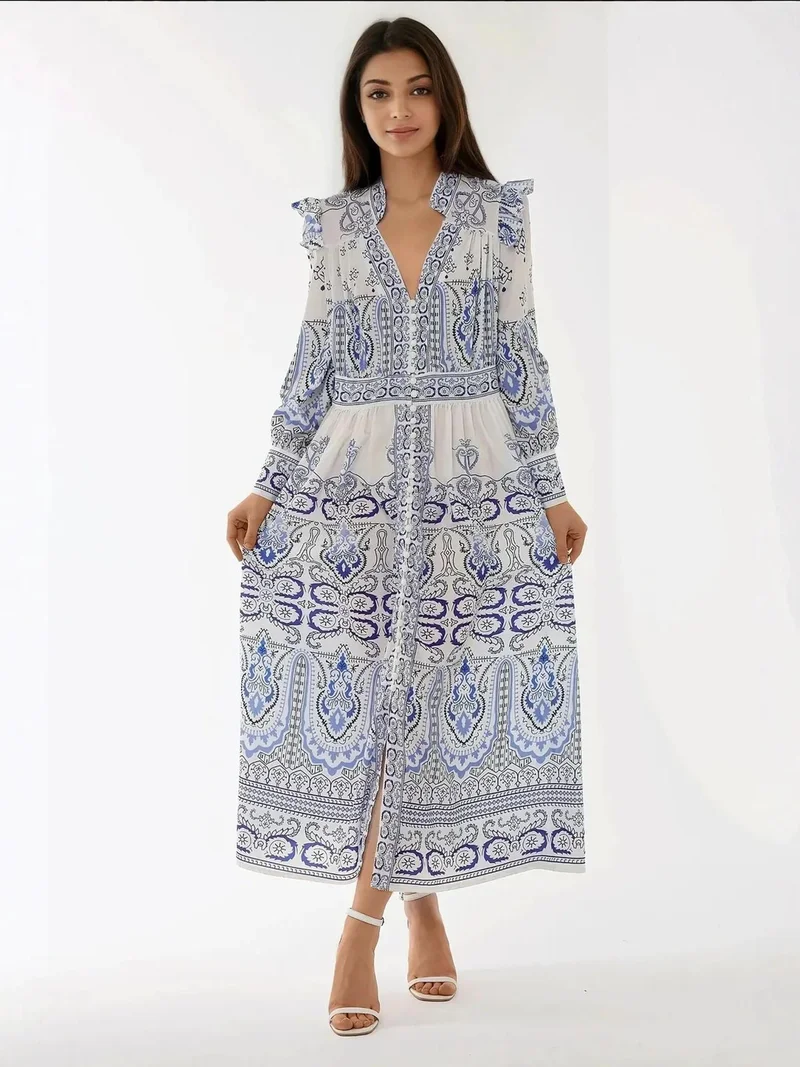 Printed Long Sleeve Viscose Maxi Dress