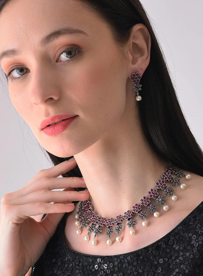 Set of 3 - Pearl Embellished Earrings, Ring & Necklace
