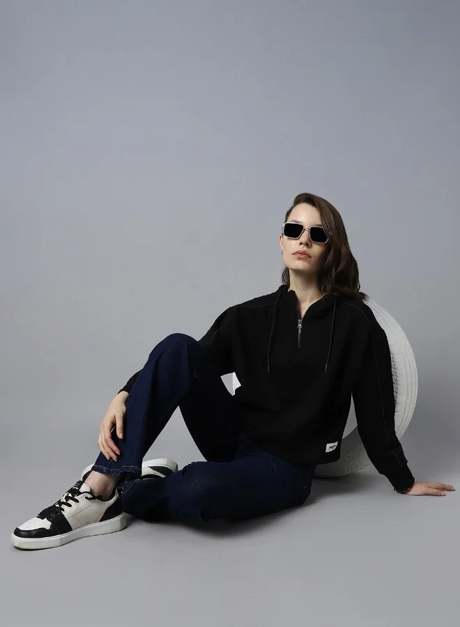Women's Black Zip-Front Hoodie With Angled Open Pockets For Casual Wear | Hooded Neck | Long Sleeve | Drawstring Closure | Cotton Sweatshirt Crafted With Comfort Fit For Everyday Wear | Black