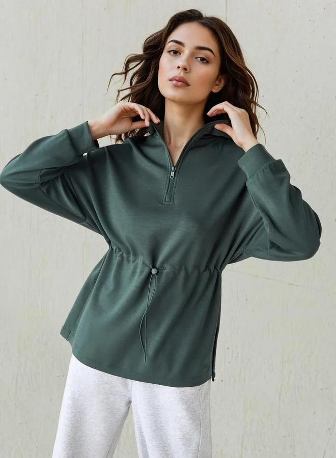 Globus Women Green Drop Shoulder Sleeves Half Zipper High Neck Oversized Heavy Fleece Sweatshirt