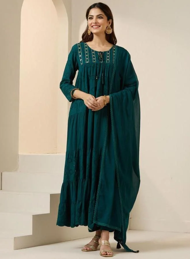 Ishin Embroidered Cotton Kurta with Dupatta and Trousers Set