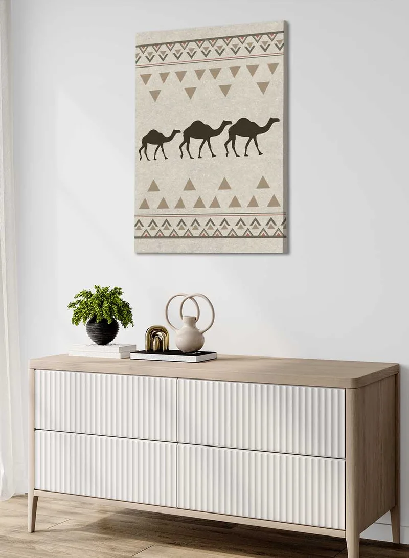 Canvas Wall Art Stretched Over Wooden Frame Depicting Camels with a Saudi Inspired Design