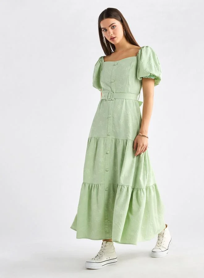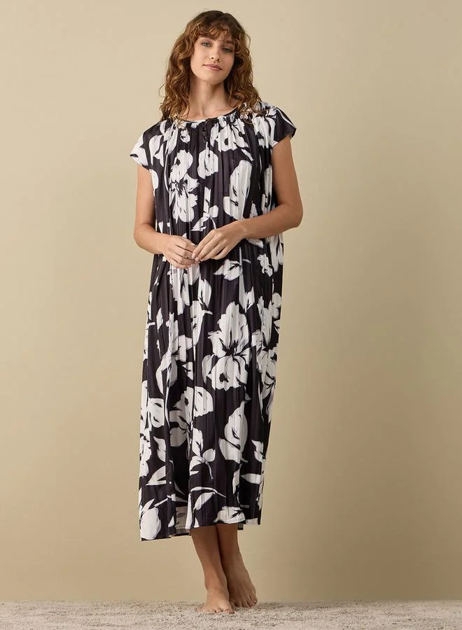 All-Over Print Round Neck Kaftan Dress with Tie-Up Belt and Slit Detail