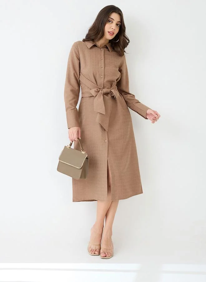 Globus Gloplus Women Brown Collared Neck Bishop Sleeves Floral Print Pleated Midi Shirt Style Plus Size Dress With Buckle Detail Belt
