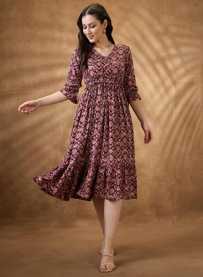 Globus Women Red Paisley Printed Bishop Sleeves Gathered & Pleat Tiered Fit & Flare Midi Dress