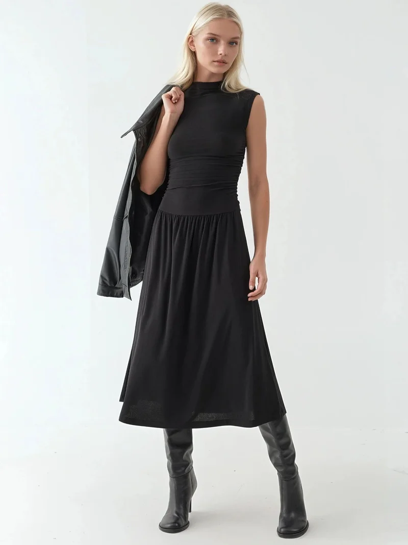 Linen Feel Sleeveless Crew Neck Midi Dress