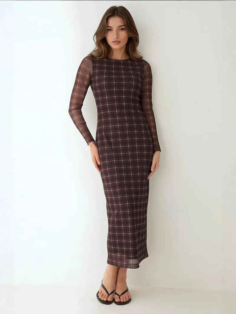 Deep V-Neck Elegant Midi Checkered Bodycon Dress