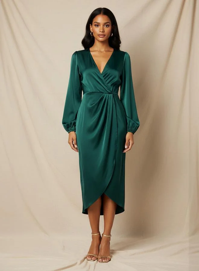 Wrap Midi Satin Dress with Puff Sleeves