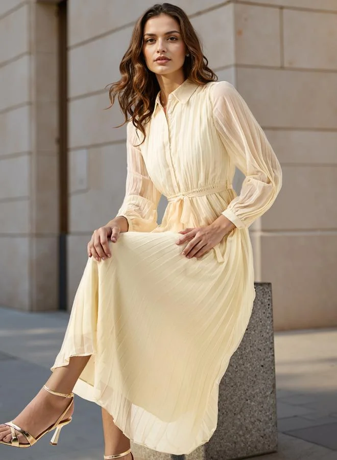 Pleated Midi Dress with Collar and Tie-Up Belt