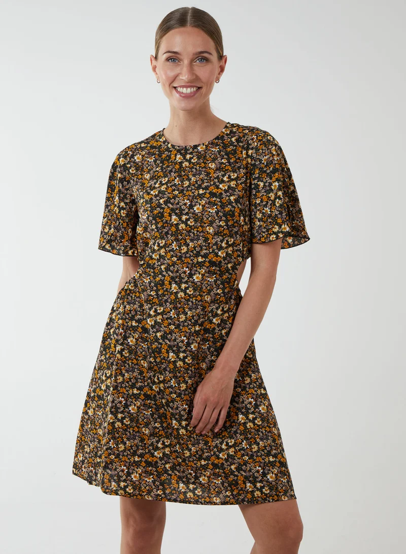 Leaf Print Elasticated Bardot Neck Tunic Dress