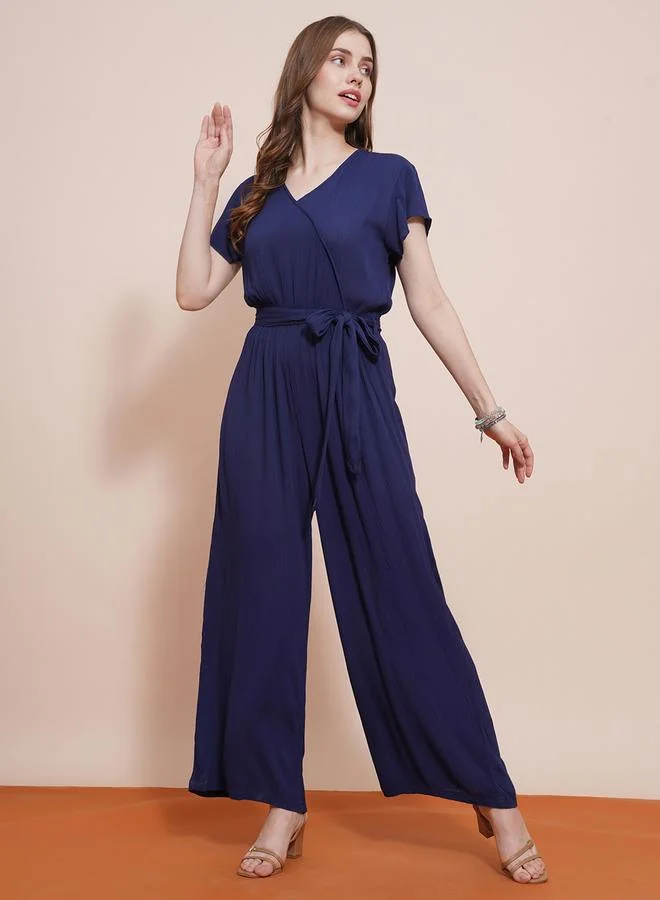 Globus Women Wrap Neck Cap Sleeves Waist Tie-Up Wide-Leg Jumpsuit