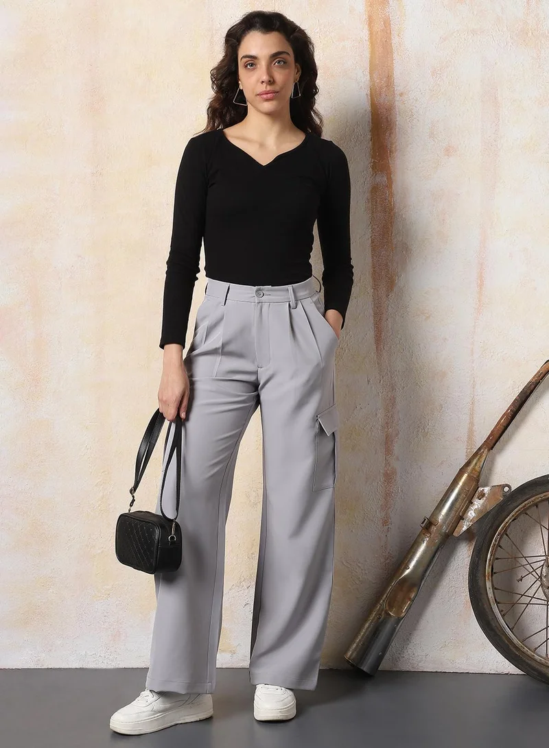 Women's Light Grey Polyester Blend Solid Full Cargo Wide Leg Trouser