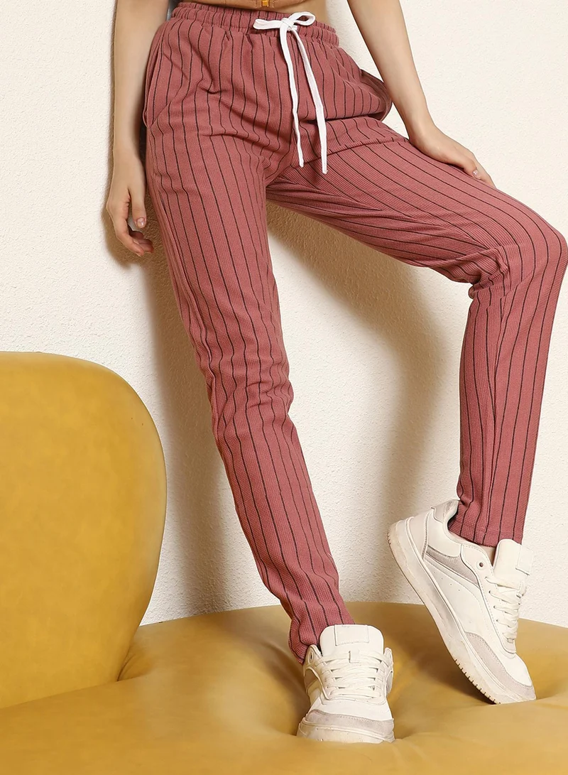 Women's Salmon Pink Pinstriped Trackpants For Casual Wear | 2 Pockets | High-Rise | Drawstring Closure | Trackpant Designed With Comfortable Fit For Woman & Girls