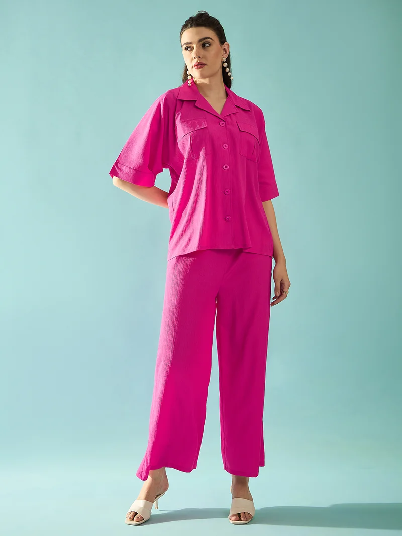 Globus Women Self Design Summer Shirt Style Crop Top With Trouser Co-Ord Set