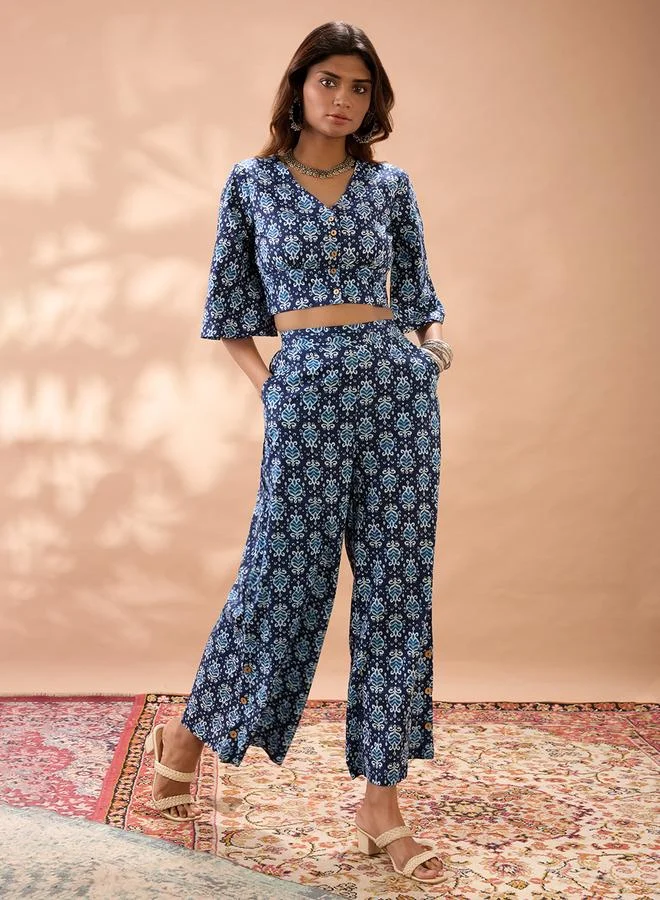 Women's All-Over-Floral Co-Ord Set For Ethnic Wear | Open-Front Neck, Quarter Kimono Sleeves | Floral Print Plain Woven Fabric | 3 Piece Co-Ords Designed For Casual & Daily Wear | Sky Blue