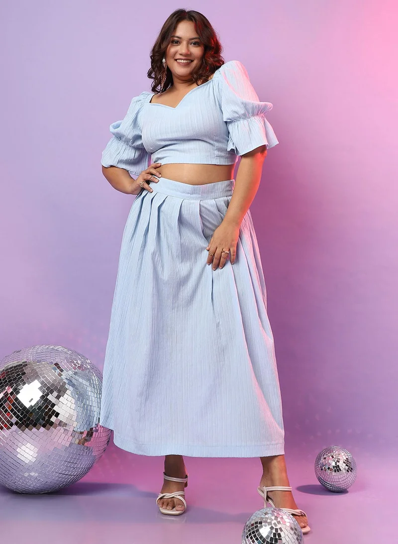Instafab Plus Women's Light Blue Cropped Co-Ord Set For Casual Wear | Puff Sleeve | Polyester Blend Fabric | Sweetheart Neck Clothing Set Crafted With Comfort Fit For Everyday Wear