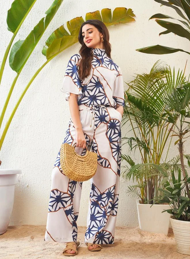 Abstract Print High Neck Top with Short Sleeves and Wide Leg Pants Co-Ord