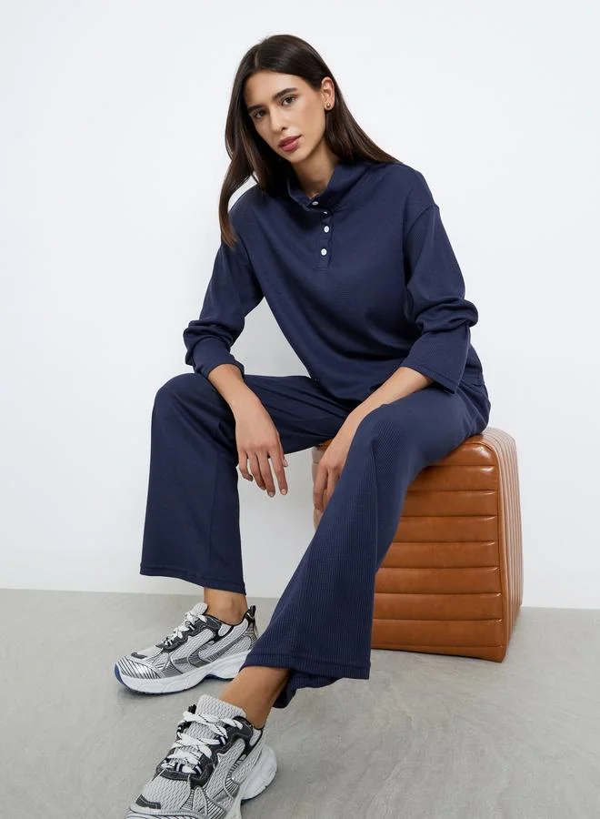 Styli Dark Blue Waffle Knit Polo Collar Top and Pants Co-Ords