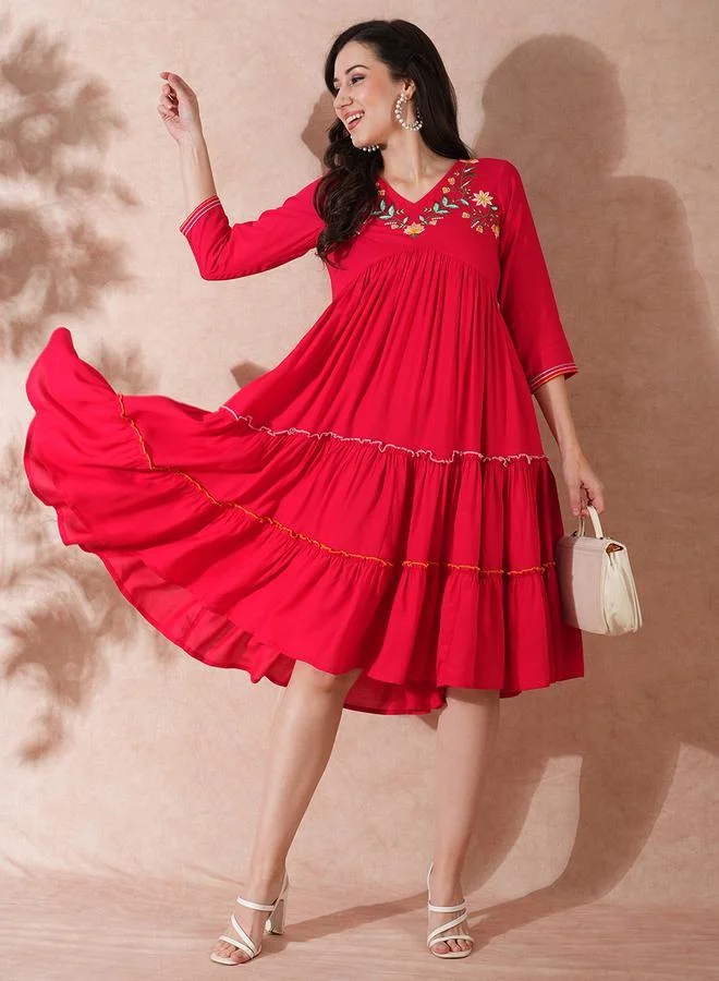 Globus Red Embroidered Yoke Alia Cut Tiered Mini Dress