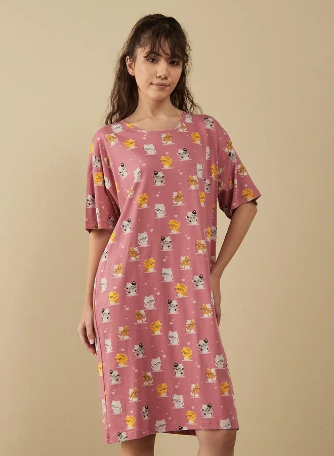Styli Bear Graphic Printed Short Sleeve Fitted T-Shirt with Ribbon Detail