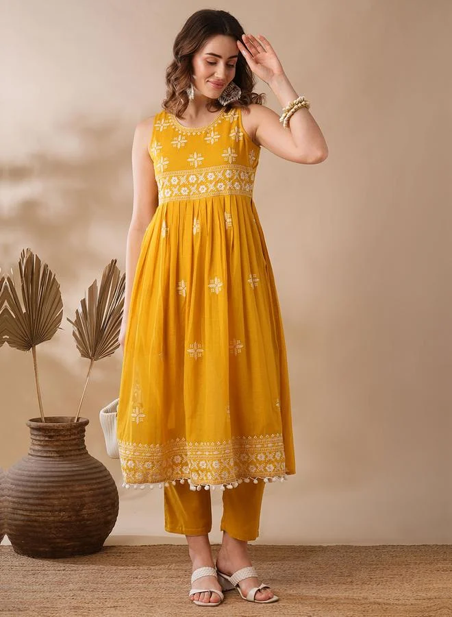 Styli Jacquard Print Gathered Detail A-Line Midi Dress