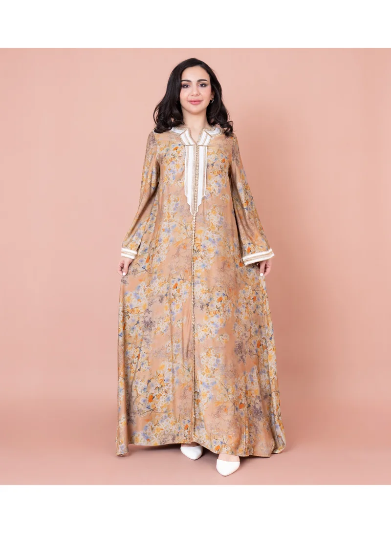 Women's Beige & Pink Flower Print Arabic Jalabiya Dress
