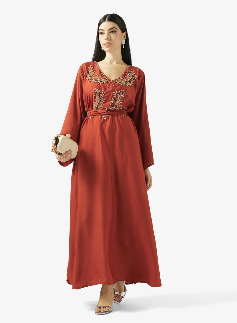Floral Beaded Embroidery Work At Front Section And Belt Jalabiya