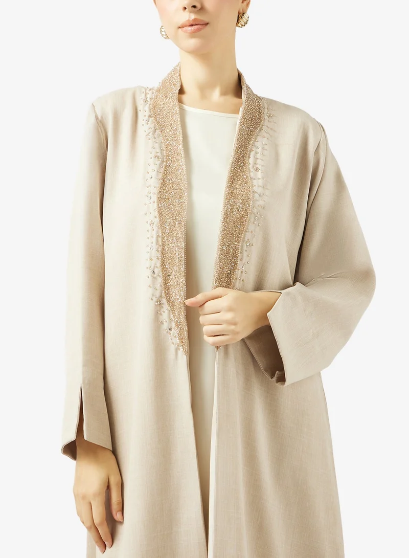 Floral Embroidered And Embellished Open Front Round Neck Abaya