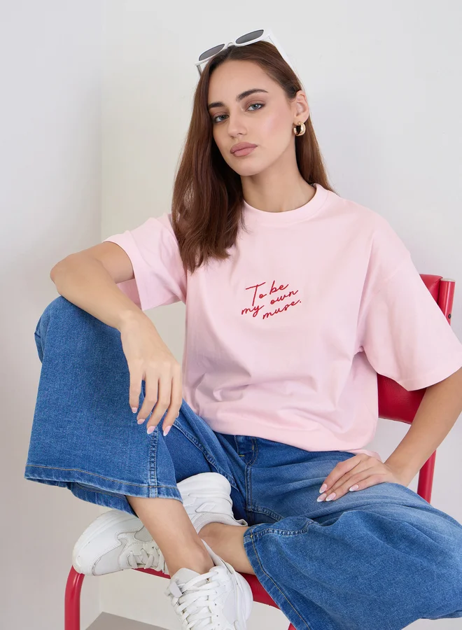 Styli Pink Slogan Print Oversized T-Shirt
