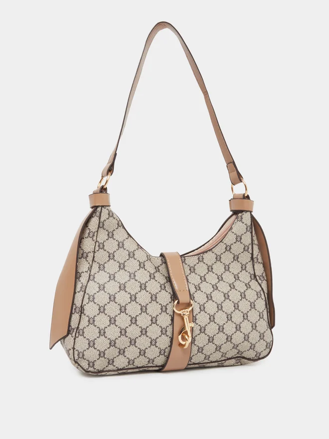 Monogram Print Shoulder Bag with Detachable Strap and Zip Closure
