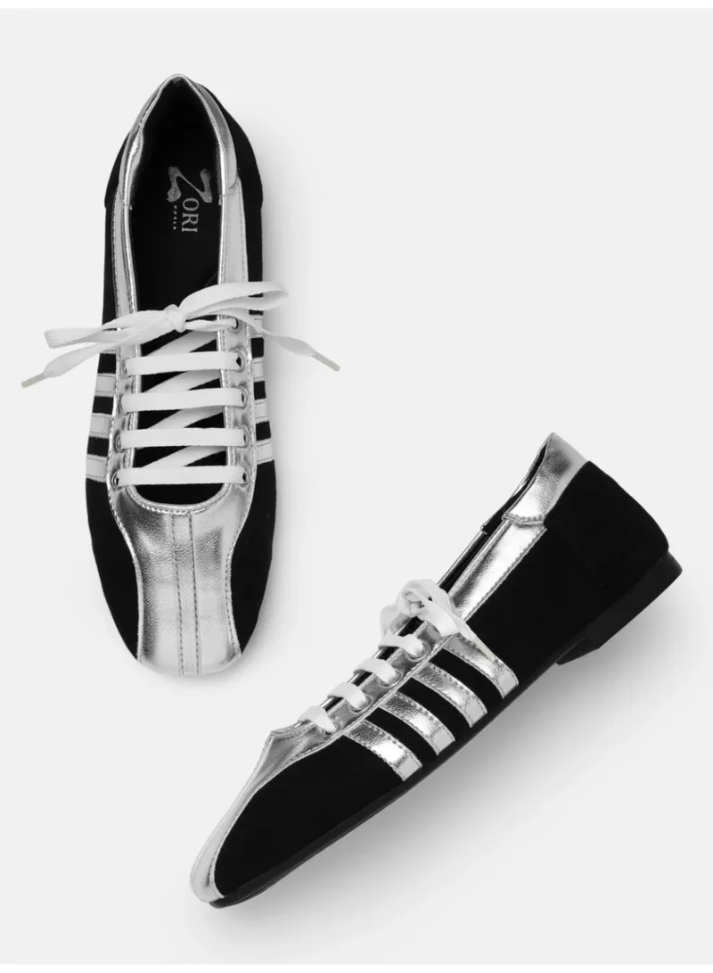 Thunder Casual Women's Black & Silver Colourblocked Lace-Up Ballerina Flats